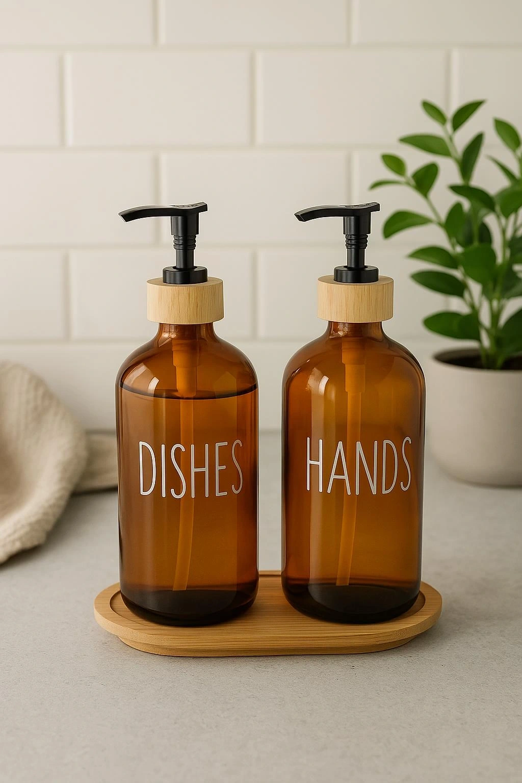 Ürün Hikayesi: Beyaz cam şişelerden oluşan bu ikili sıvı sabunluk seti, bambu altlığı ile zarif ve modern bir görünüm sunar. Hem mutfak hem de banyo kullanımı için şık bir seçenektir.