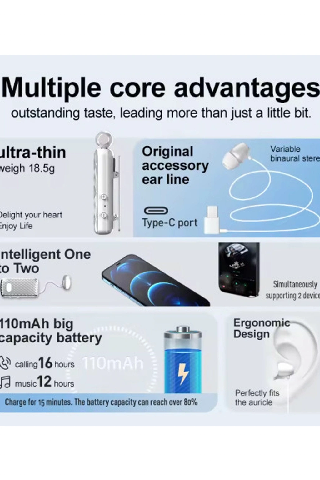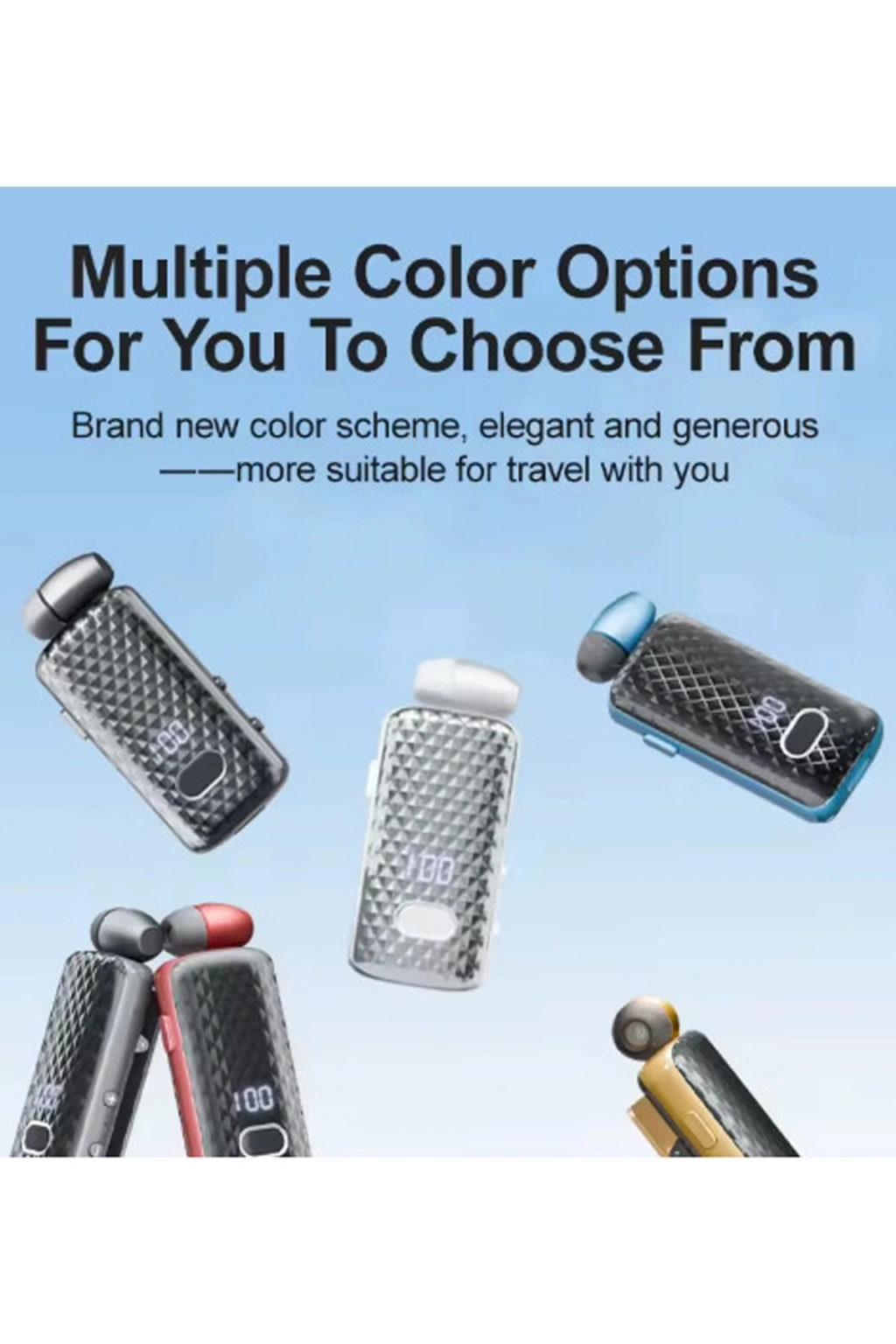 Sıkıca Klipsli tasarlanmış, kolayca ve rahatça Kabloyu otomatik olarak geri almak için tek tıklamayla Arayanın Kimlik numarası istemi ve Titreşim İstemi Çoğu akıllı telefonla uyumludur bluetooth Güç LED ekranı 15 dakikalık hızlı şarj desteği 10 saatlik kullanım zaman