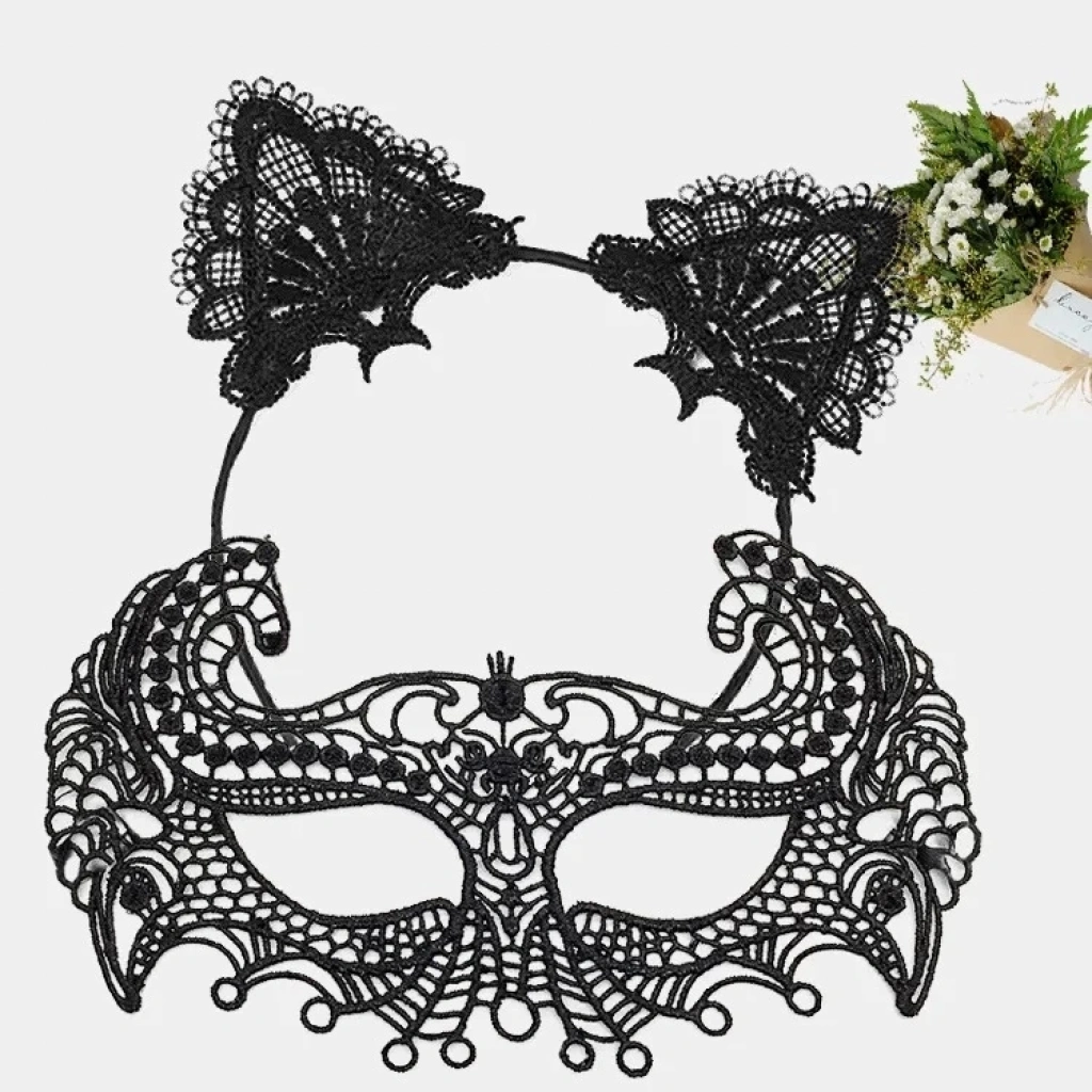 Siyah Renk Dantel Maske Ve Dantel Kulak Taç Seti Yetişkin No 4