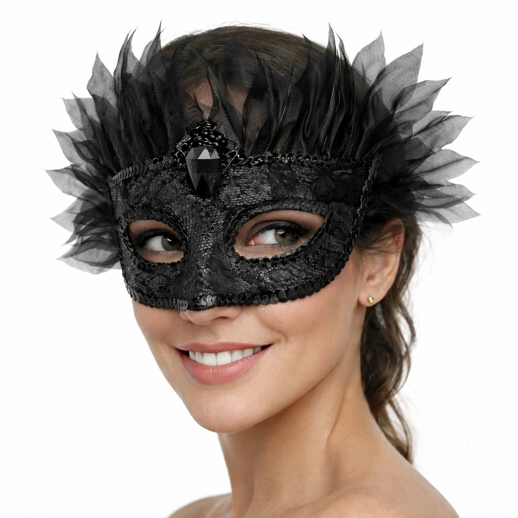 Gizemli ve zarif bir görünüm için tasarlanan siyah taşlı tüllü Venedik maskesi, özel davetlerinizde stilinizi ön plana çıkarır. Ön kısmındaki büyük taş detayı ve etrafındaki yoğun tül saçak tasarımı ile premium bir görünüm sunar.