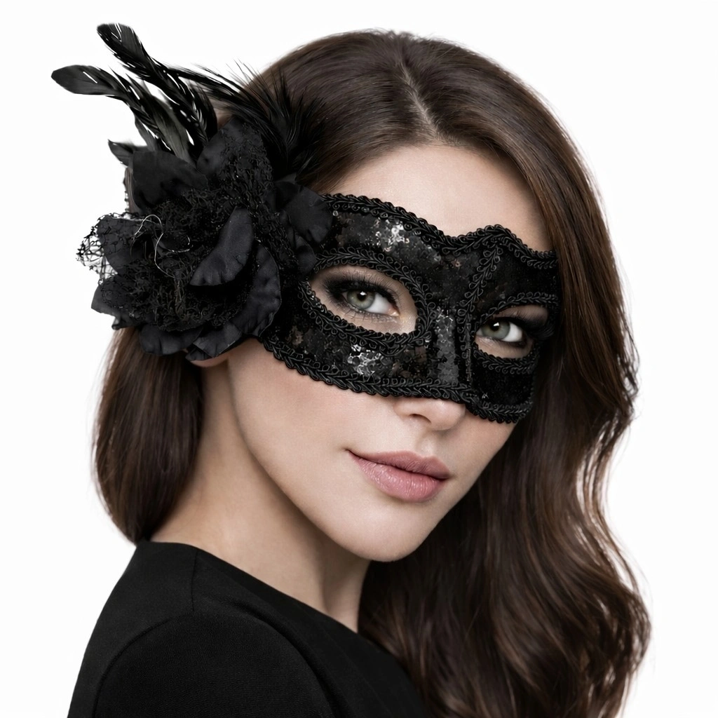 Gizemli ve zarif bir görünüm için tasarlanan Siyah Çiçekli Tüylü Venedik Maskesi, özel gecelerin vazgeçilmez aksesuarıdır.