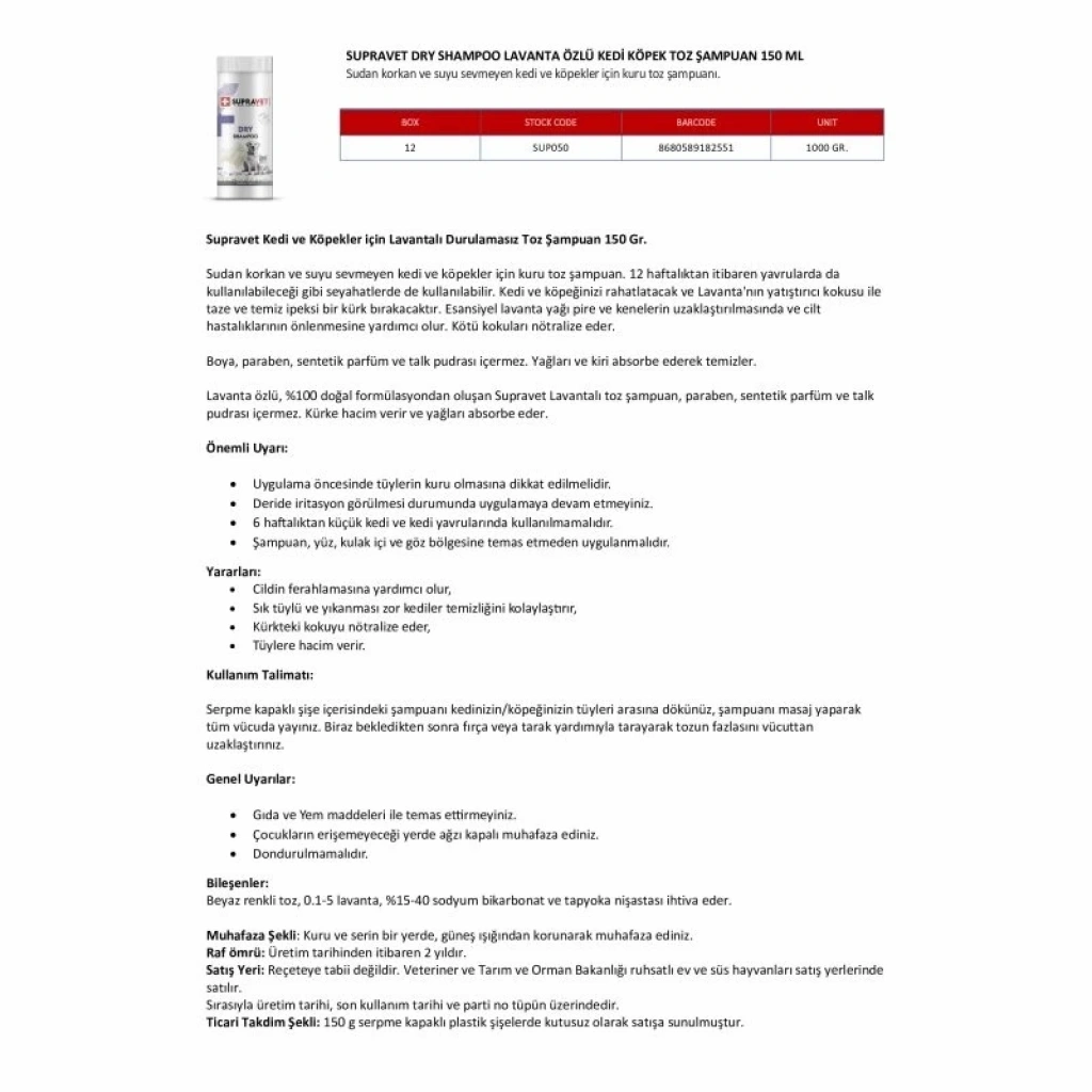 Supravet Dry Shampoo Lavanta Özlü Kedi ve Köpek Toz Şampuan, evcil hayvanlarınızın temizliği ve bakımı konusunda pratik bir çözüm sunar.