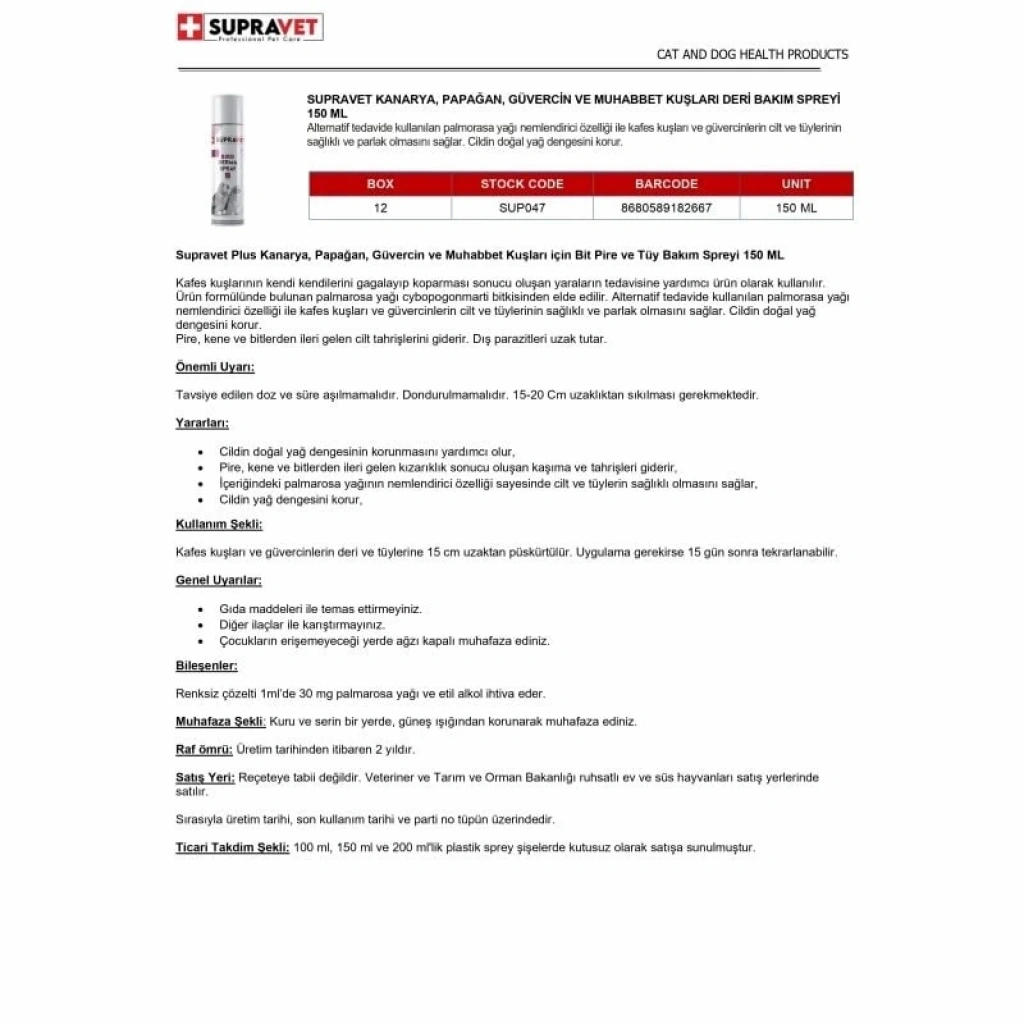 Supravet Deri Bakım Spreyi, kanaryalar, papağanlar, güvercinler ve muhabbet kuşları gibi kuş türleri için özel olarak formüle edilmiş bir deri bakım ürünüdür. Kuşlarınızın deri sağlığını korumak, tüy dökülmesini azaltmak ve parlak bir tüy yapısı oluşturmak için ideal bir çözümdür.